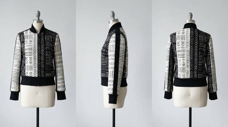 Black‑and‑white patterned jacket with high collar, zip‑front, tribal Aztec motifs, geometric diamonds and triangles, symmetrical design, bold contrast, modern fashion, cultural inspiration, striking