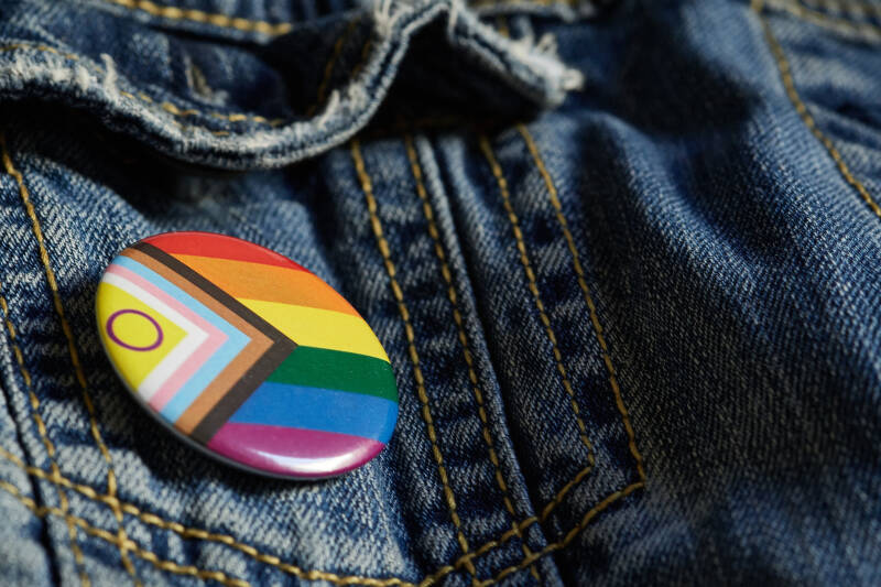 Close-up image of an LGBTQ+ pride badge attached to a blue denim jacket. The pin features the inclusive Progress Pride Flag, representing support, diversity, and the LGBTQ+ community.